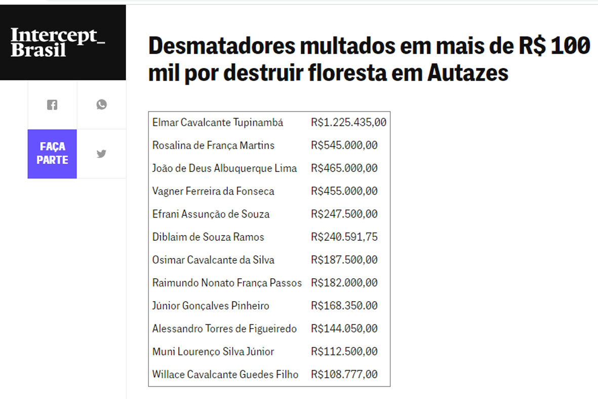 Tupinambá e Silva Júnior se somam a outras 10 pessoas multadas em mais de R$ 100 mil por desmatamento ilegal em Autazes nos últimos 10 anos. Ao todo, o Ibama e o IPAAM aplicaram mais de R$ 5,2 milhões em multas só no município. Os valores variam de R$ 1.800 a quase R$ 800 mil. Algumas pessoas, como é o caso de Tupinambá, acumulam mais de uma multa.