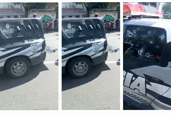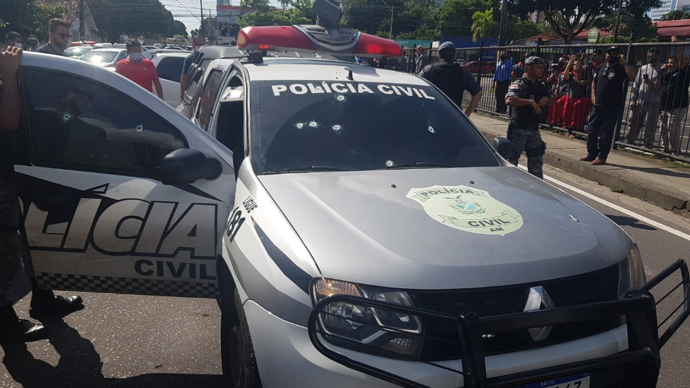 Uma viatura da Polícia Civil do Amazonas, transportando três detentos a caminho de uma audiência de custódia, foi metralhada por volta das 14h30, desta quinta-feira, 06/01, em frente ao Fórum Ministro Henoch Reis, que fica na rua Valério Botelho de Andrade, no bairro São Francisco, na zona Centro-Sul de Manaus.