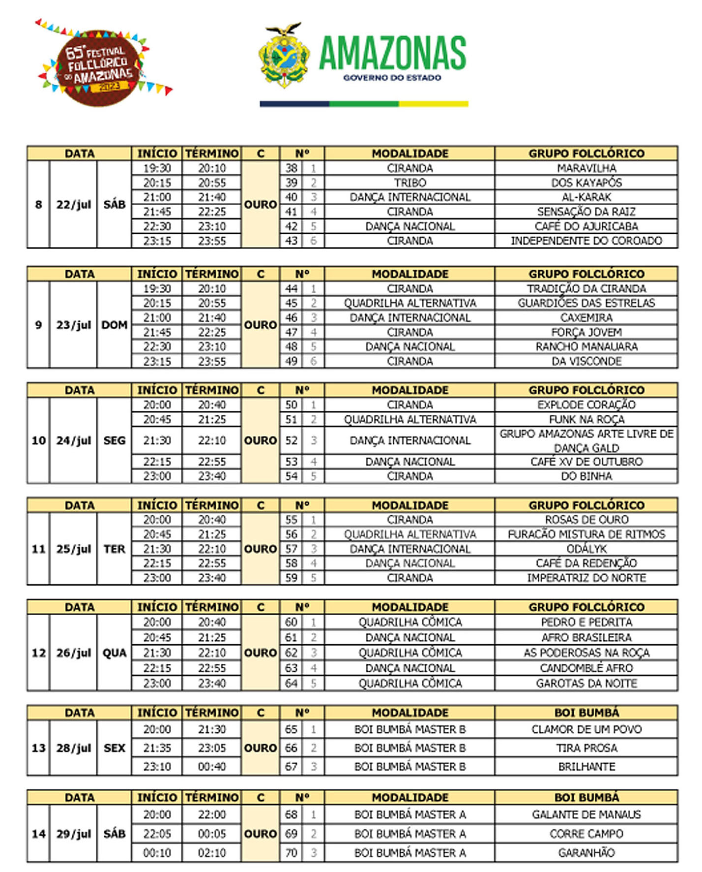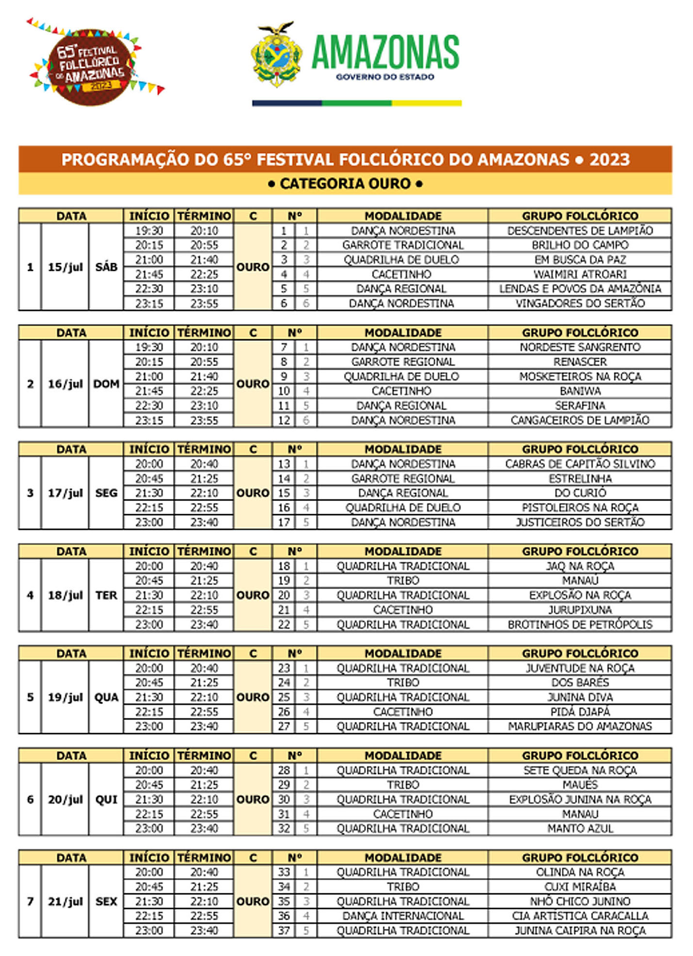 A disputa pelos primeiros lugares na Categoria Ouro do 65º Festival Folcórico do Amazonas começam no dia 15 de julho, às 19h30, com as apresentações da Dança Nordestina, Garrote Tradicional, Quadrilha de Duelo, Cacetino, Dança Regional e Dança Nordestina.