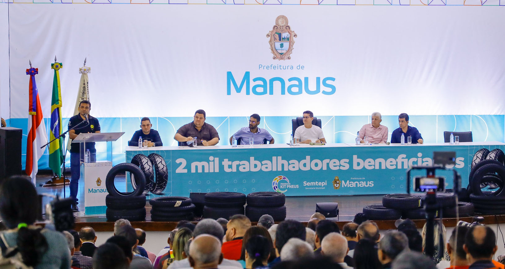 O prefeito de Manaus, David Almeida, realizou, nesta quinta-feira, 20/10, o início da entrega do ‘Kit Pneus’ para os quase 2 mil taxistas, mototaxistas, motoboys, táxi-frete e condução escolar cadastrados no programa lançado pela Secretaria Municipal do Trabalho, Empreendedorismo e Inovação (Semtepi), que busca fortalecer a cultura empreendedora na capital amazonense. O evento foi realizado no auditório Isabel Victoria de Mattos Pereira do Carmo Ribeiro, localizado na sede da Prefeitura de Manaus, na avenida Brasil, Compensa, zona Oeste, e contou com a presença de representantes das classes contempladas na ação.