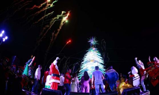 A Prefeitura de Manaus, por meio do Fundo Manaus Solidária (FMS), entregou, na noite deste domingo, 5/12, a tradicional árvore de Natal do complexo turístico Ponta Negra, zona Oeste. Após contagem regressiva, puxada pelo prefeito David Almeida, foi feito o acendimento das luzes da estrutura de 40 metros, assinada pelo artista parintinense Rossy Amoedo.