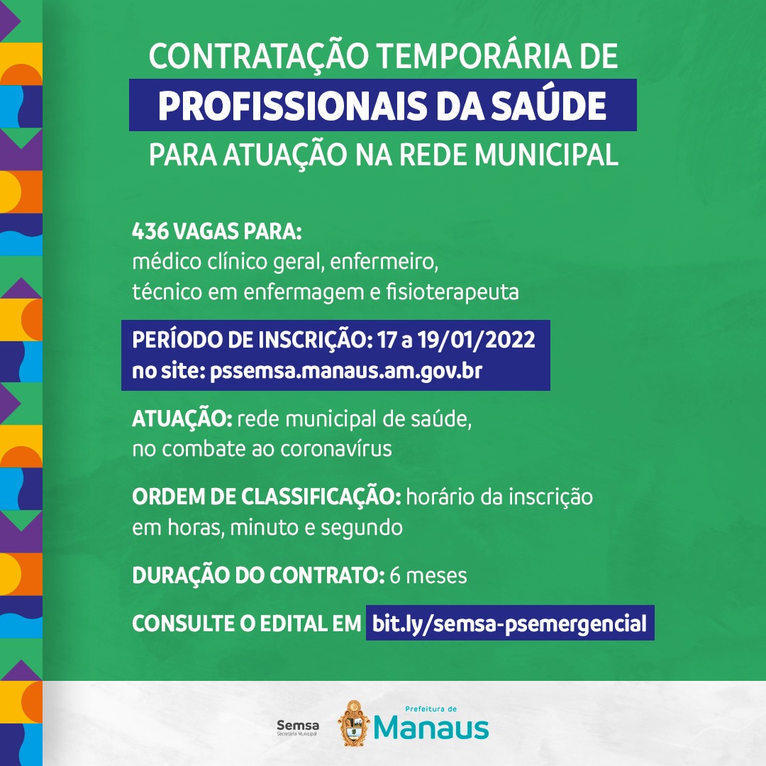 A Prefeitura de Manaus publicou em edição extra (nº 5.264) do Diário Oficial do Município (DOM), deste sábado, 15/1, o edital 001/2022 de Chamamento Público Emergencial para Contratação Temporária de profissionais para atuação na Secretaria Municipal de Saúde (Semsa). A medida visa fortalecer o trabalho de enfrentamento à Covid-19 na capital, no cenário de crescimento de casos da doença e outras síndromes gripais. Estão sendo oferecidas 436 vagas para médicos clínicos gerais, enfermeiros, técnicos em enfermagem e fisioterapeutas, e as inscrições podem ser feitas a partir de segunda-feira, 17/1, pela internet.