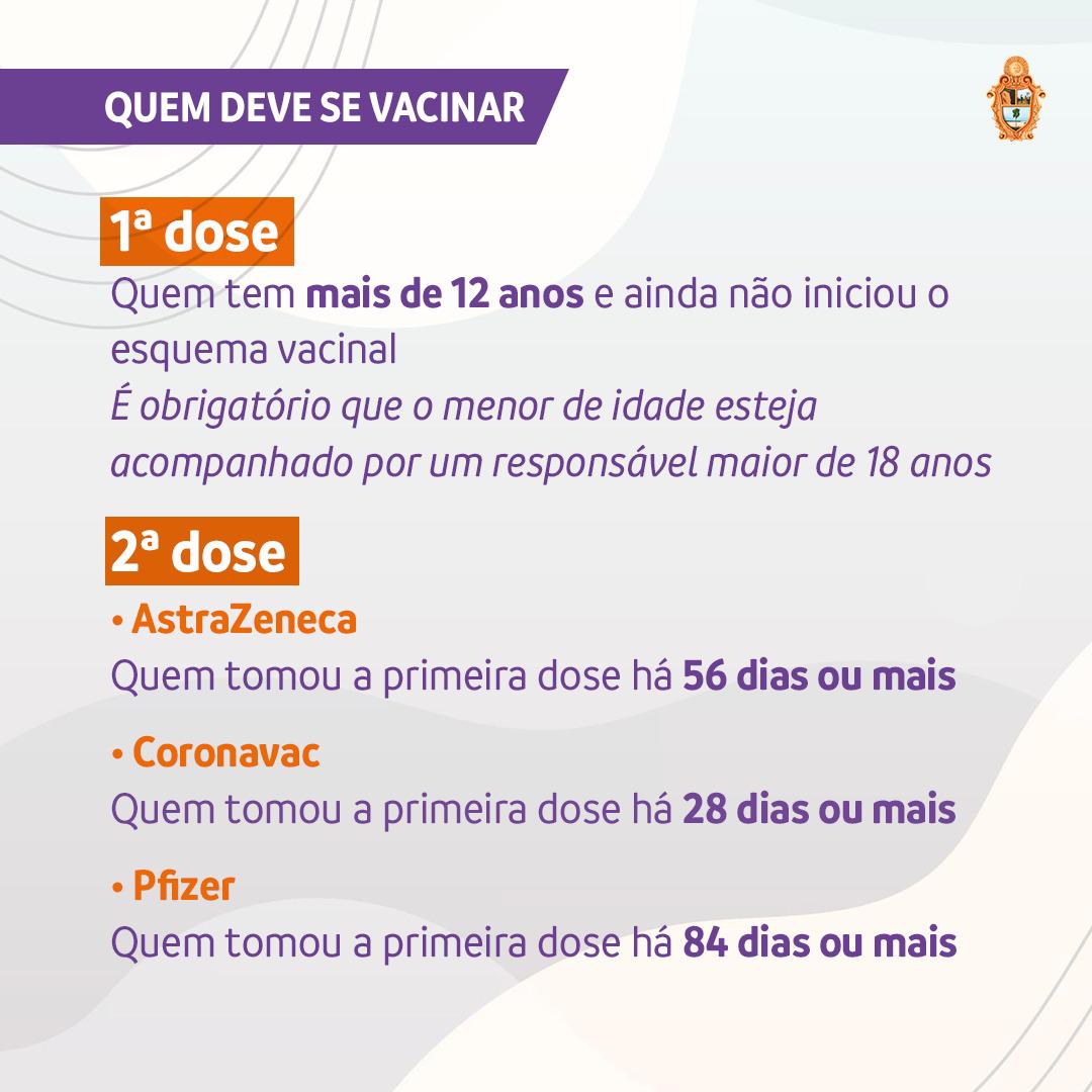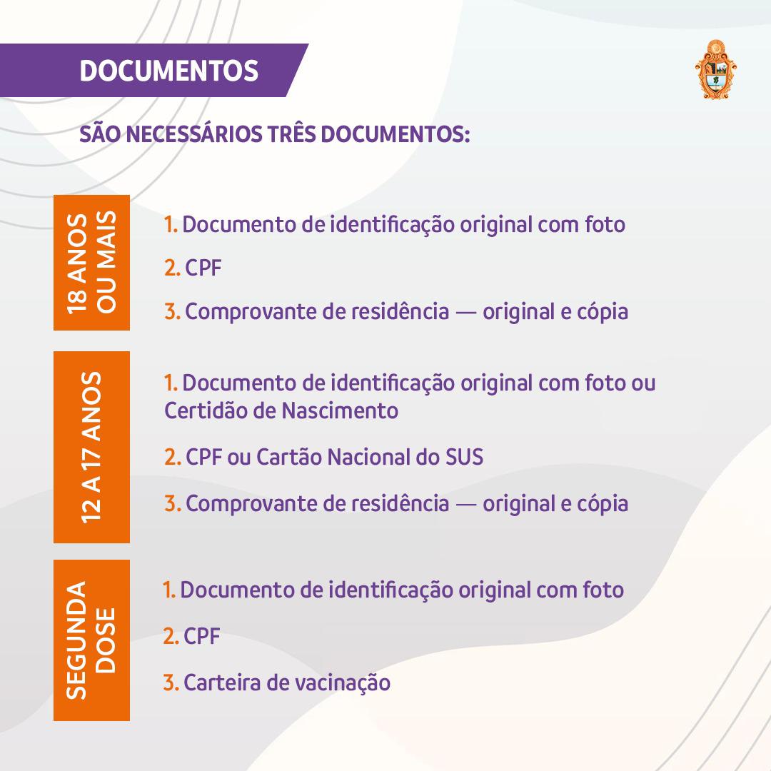 Para receber a primeira dose, as pessoas a partir dos 18 anos devem apresentar um documento de identificação original e com foto, CPF e comprovante de residência, com cópia. Para a segunda dose, só é necessário levar a identificação, o CPF e o cartão de vacinação com o registro da primeira dose.