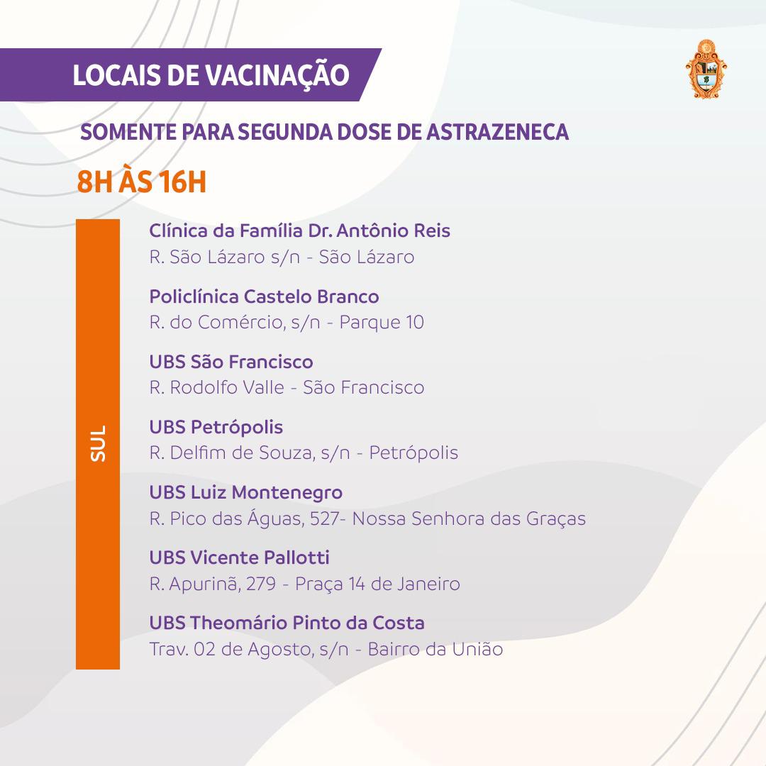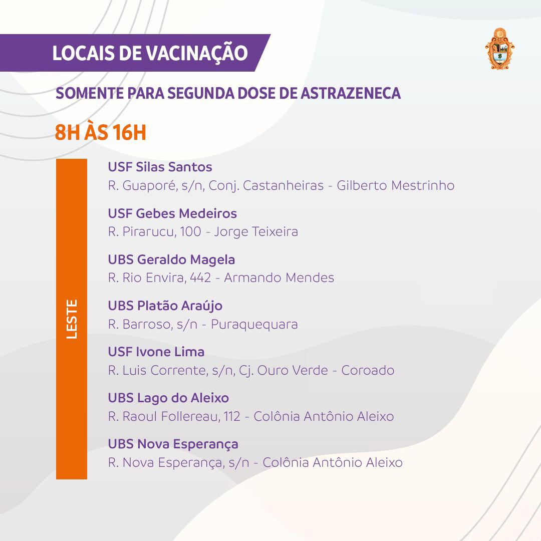 A Prefeitura de Manaus definiu 33 pontos para a vacinação contra a Covid-19 nesta segunda-feira, 6/9, véspera do feriado em comemoração à Independência do Brasil. A lista com os endereços das unidades pode ser consultada no site da Secretaria Municipal de Saúde (Semsa), no link https://bit.ly/38LqteB. O atendimento será das 8h às 16h. Na terça-feira, 7, os pontos não funcionarão, o que voltará a acontecer na quarta-feira, 8, em locais que poderão ser consultados já a partir das 18h desta segunda-feira, no mesmo endereço eletrônico.