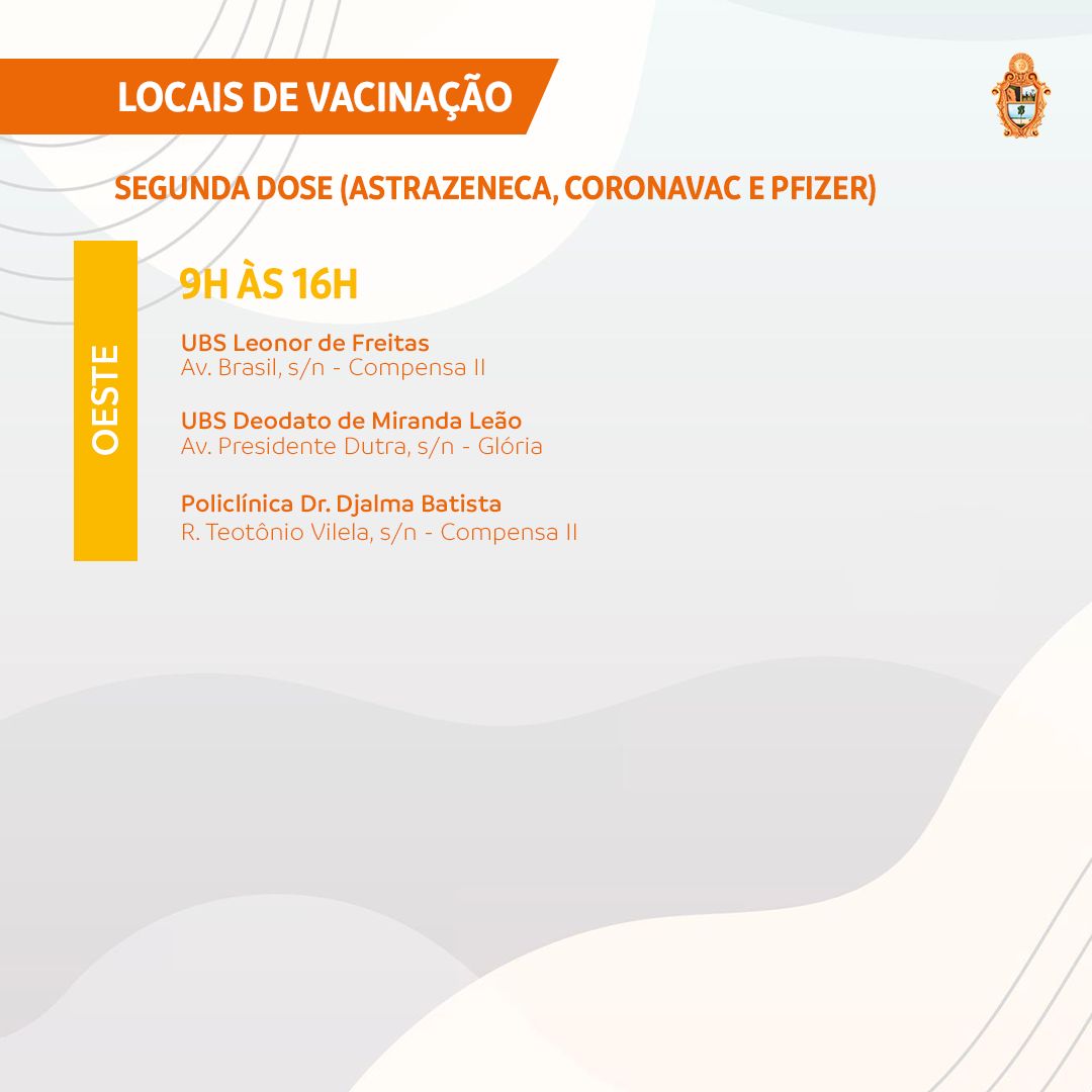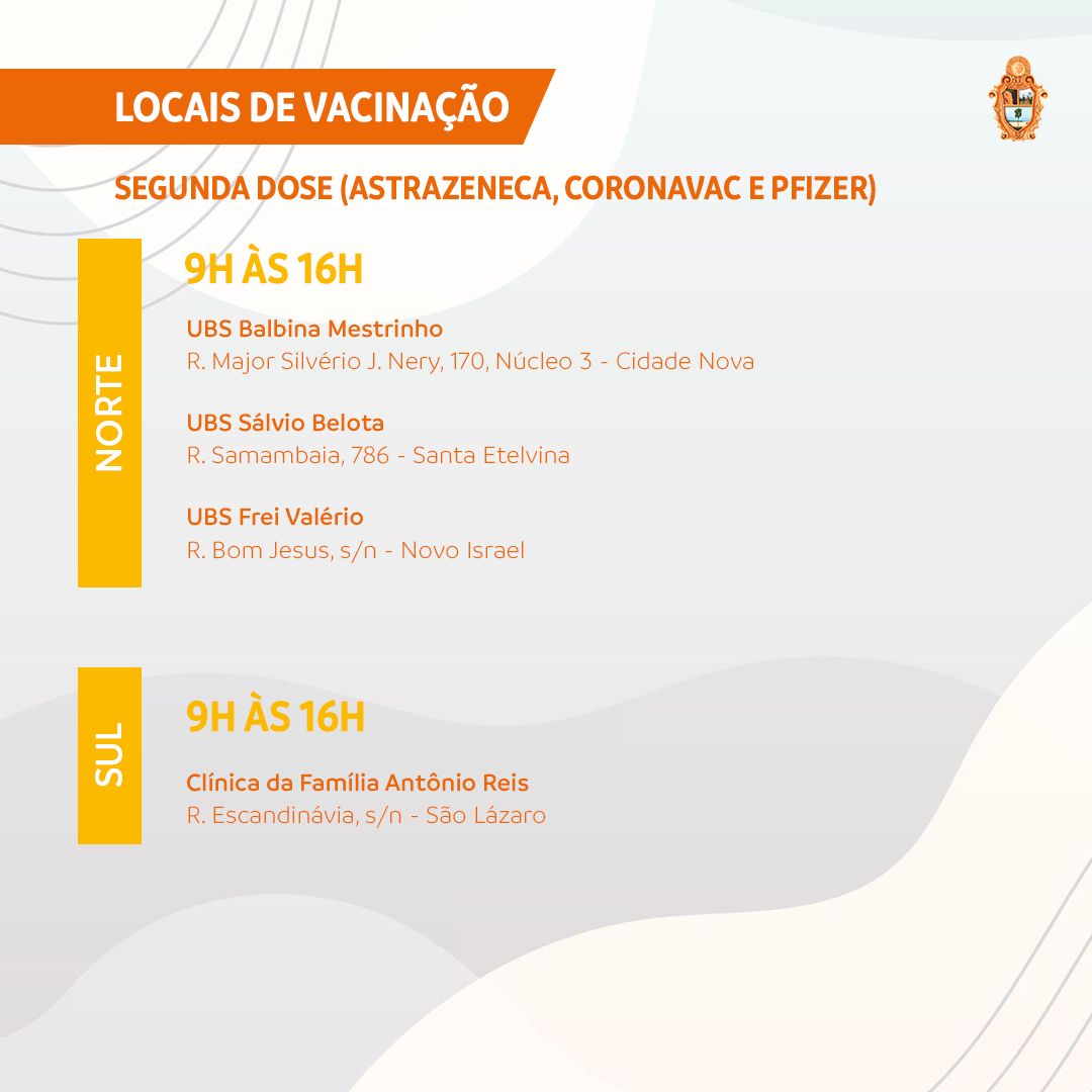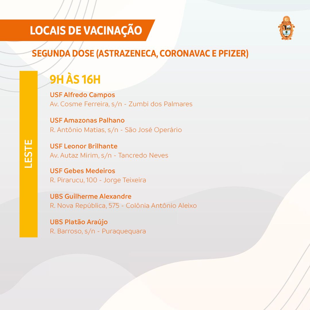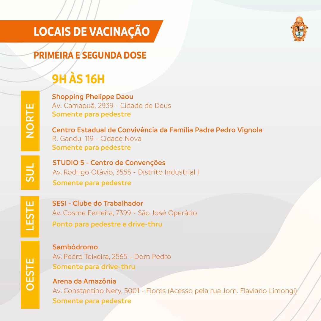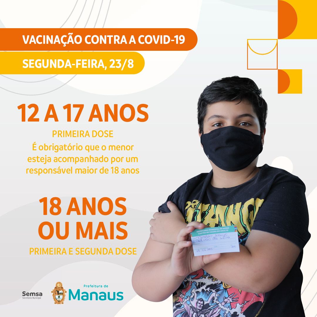 A Prefeitura de Manaus terá 19 pontos de atendimento para a vacinação contra a Covid-19 nesta segunda-feira, 23/8. Serão seis pontos estratégicos – Centro de Convenções de Manaus, o “sambódromo”; Studio 5 Centro de Convenções; Centro de Convivência da Família Padre Pedro Vignola; Clube do Trabalhador do Sesi-AM; shopping Phelippe Daou e Arena da Amazônia, onde haverá a primeira e segunda doses. Também estarão atuando 13 unidades da Secretaria Municipal de Saúde (Semsa), sendo 11 UBSs, uma policlínica e uma clínica da família, que vão oferecer apenas a segunda dose dos imunizantes CoronaVac/Butantan, AstraZeneca/Oxford e Pfizer/BioNTech. O horário de funcionamento será das 9h às 16h.