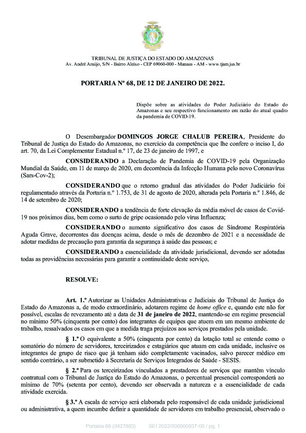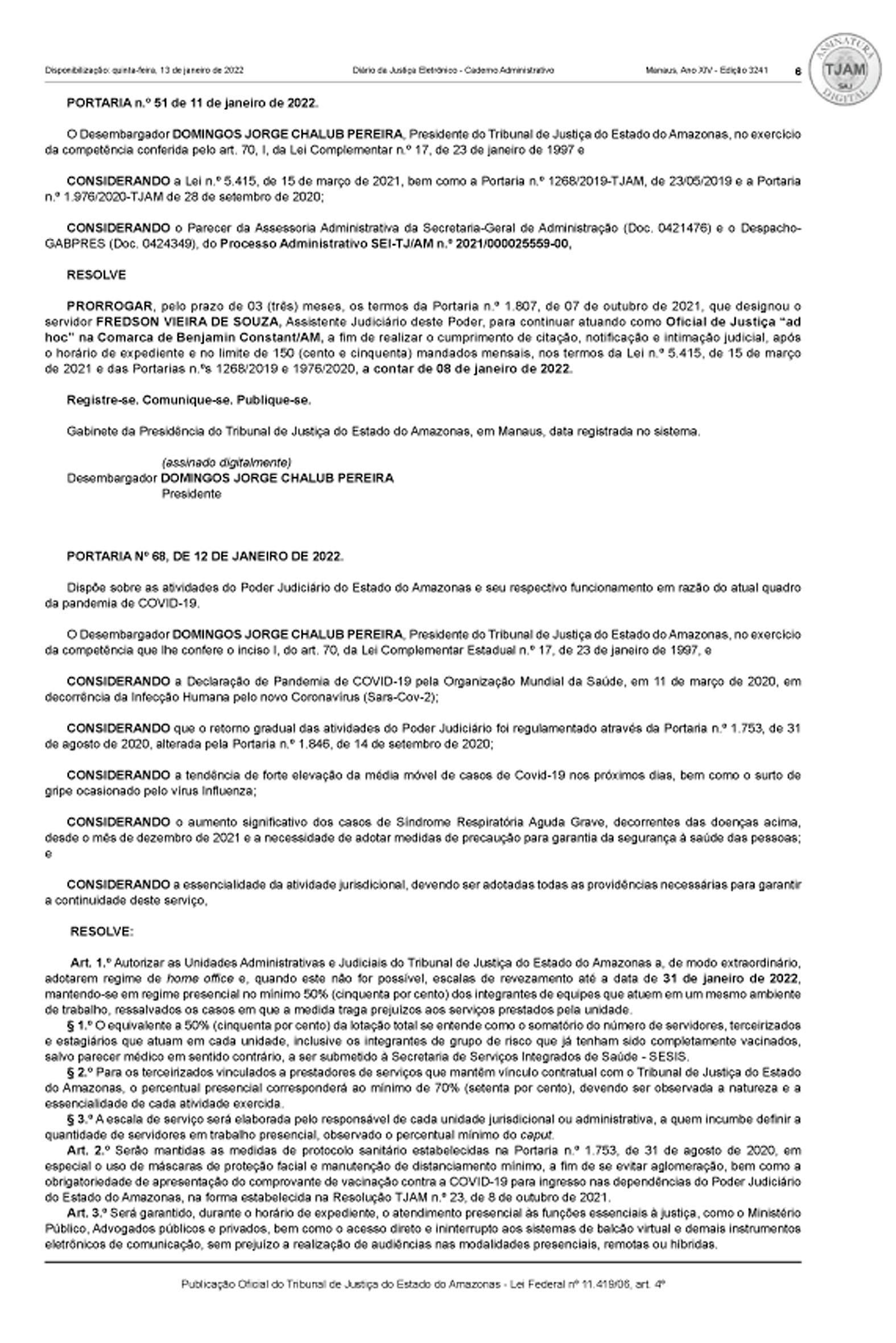 A Portaria n.º 68, de 12/01/2022, assinada pelo presidente do TJAM, desembargador Domingos Jorge Chalub Pereira, foi publicada nesta quinta-feira (13/1) no Diário da Justiça Eletrônico (DJE), páginas 6 e 7 do caderno Administrativo, e observa a necessidade de providências para garantir a continuidade dos serviços judiciais, por sua essencialidade.