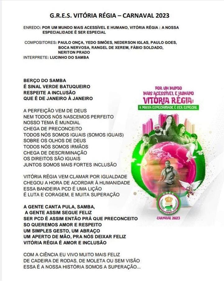 De acordo com o presidente da agremiação carnavalesca, Darlan Braga, a Vitória Régia vai fazer a alegria do povo abordando no Carnaval 2023 uma temática importante para o desenvolvimento de toda sociedade, que é o respeito, principalmente com às pessoas com defidiência, "que também merecem atenção e carinho, pois antes de mais nada são seres humanos".