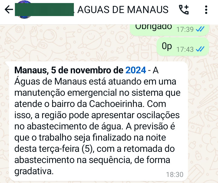 Acionada pelo whats app, a assessoria de imprensa da Águas de Manaus não esclareceu o novo corte no fornecimento da água até a publicação deste texto.