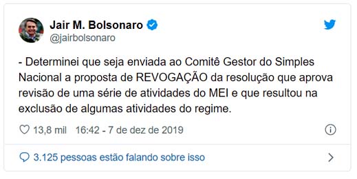 O presidente Jair Bolsonaro informou hoje (7), em mensagem no Twitter, que determinou o envio ao Comitê Gestor do Simples Nacional de proposta de revogação da medida que aprova a revisão de uma série de atividades que podem atuar como microempreendedores individuais (MEI). A medida resultou na exclusão de algumas profissões do programa.
