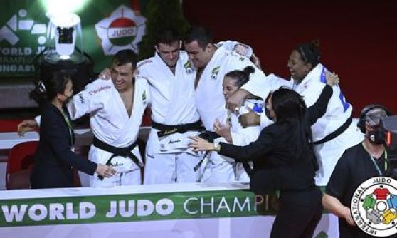 Neste domingo (13), em Budapeste, na Hungria, o Brasil conquistou a medalha de bronze na disputa por equipes mistas. Beatriz Souza (+70kg), Maria Portela (70kg), David Moura (+90kg) e Ketelyn Nascimento (57kg) venceram suas lutas e garantiram o terceiro pódio verde e amarelo no último dia de disputas. Com os bronzes de Maria Suelen Altheman e de Beatriz Souza, no individual, a equipe nacional iguala o desempenho do último Mundial (2019), com três bronzes.