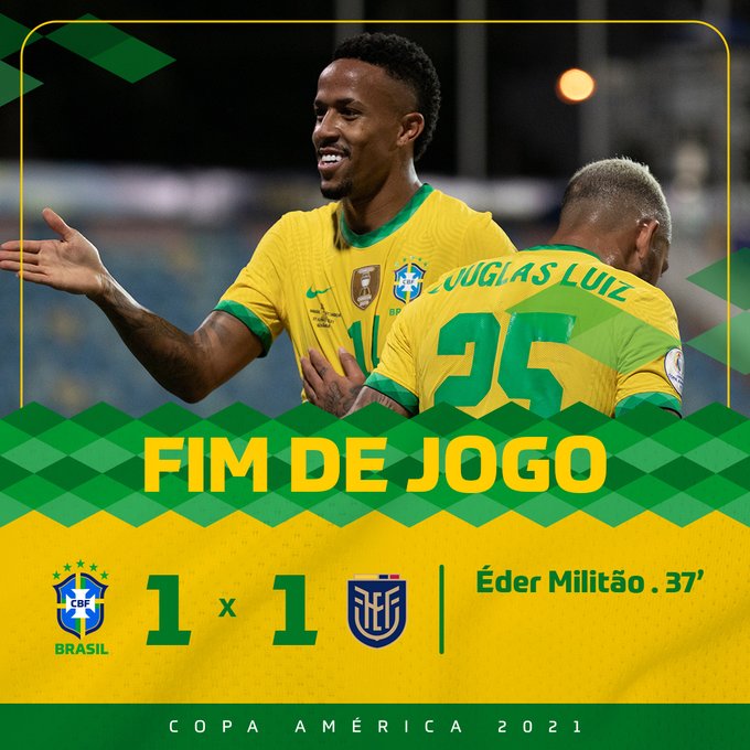 O Brasil empatou em 1 a 1 com o Equador, na noite deste domingo (27) no estádio Olímpico de Goiânia, pela 5ª rodada do Grupo B da Copa América. Com este resultado, a equipe comandada pelo técnico Tite perdeu o aproveitamento perfeito que vinha tendo na competição.
