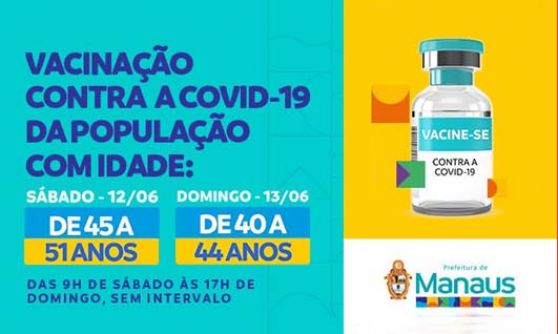 Manaus terá ao longo deste fim de semana (dias 12 e 13 de junho) uma grande mobilização de vacinação contra a Covid-19. Com postos inclusive em sistema de “viradão”, a imunização tem como alvo o público de 45 a 51 anos no sábado e de 40 a 44 no domingo. A expectativa é que mais de 200 mil pessoas sejam vacinadas.