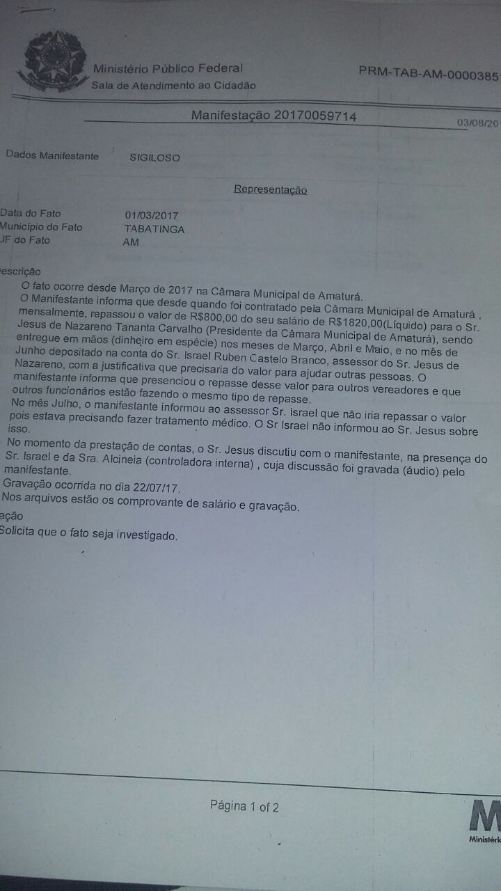 O presidente da Câmara Municipal de Amaturá, município situado na região do Alto Solimões, a 930 quilômetros de Manaus, no Amazonas, Jesus de Nazareno Tananta Carvalho (PSDB), está sendo acusado de cobrar R$ 800,00 por mês do salário de R$ 1.820,00 de Josenei Gama e vários servidores daquele município.