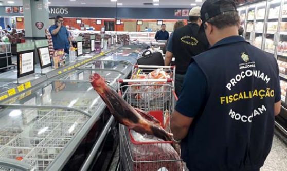 Em fiscalização conjunta realizada com órgãos de defesa do consumidor do Amazonas e coordenada pelo Ministério Público do Estado (MP-AM), o Programa Estadual de Proteção e Orientação do Consumidor (Procon-AM) apreendeu e inutilizou quase 300 kg de carnes estragadas e outros alimentos que estavam impróprios ao consumo humano, devido o vencimento da data de validade, a falta da mesma, embalagens amassadas, violadas e mal acondicionadas no supermercado DB, unidade Paraíba, localizada na avenida Umberto Calderaro Filho, bairro Adrianópolis, zona centro-sul.