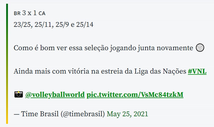 A seleção brasileira feminina de vôlei estreou com vitória na Liga das Nações 2021 na tarde desta terça-feira (25). Entrando em quadra pela primeira vez após um hiato de quase dois anos por causa da pandemia do novo coronavírus (covid-19), a equipe dirigida pelo técnico José Roberto Guimarães venceu o Canadá por 3 sets a 1 (parciais de 23/25, 25/11, 25/09 e 25/14).